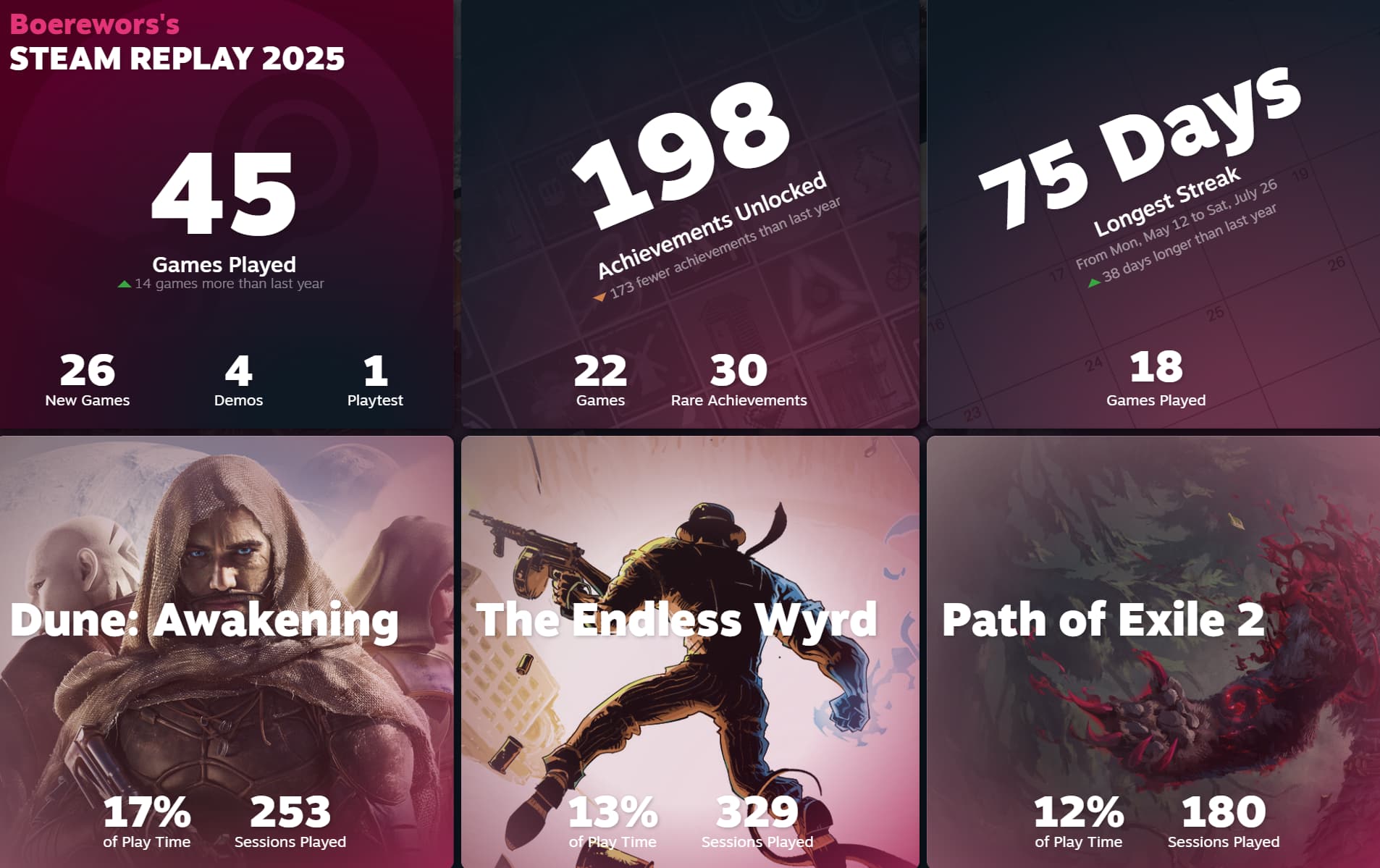 Played a LOT less on Steam this year since so many great games were on Game Pass. That should change next year though.