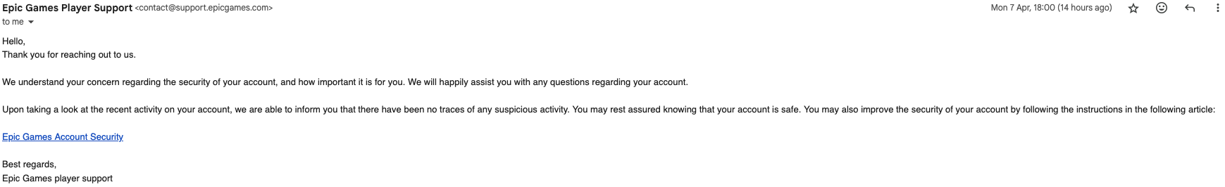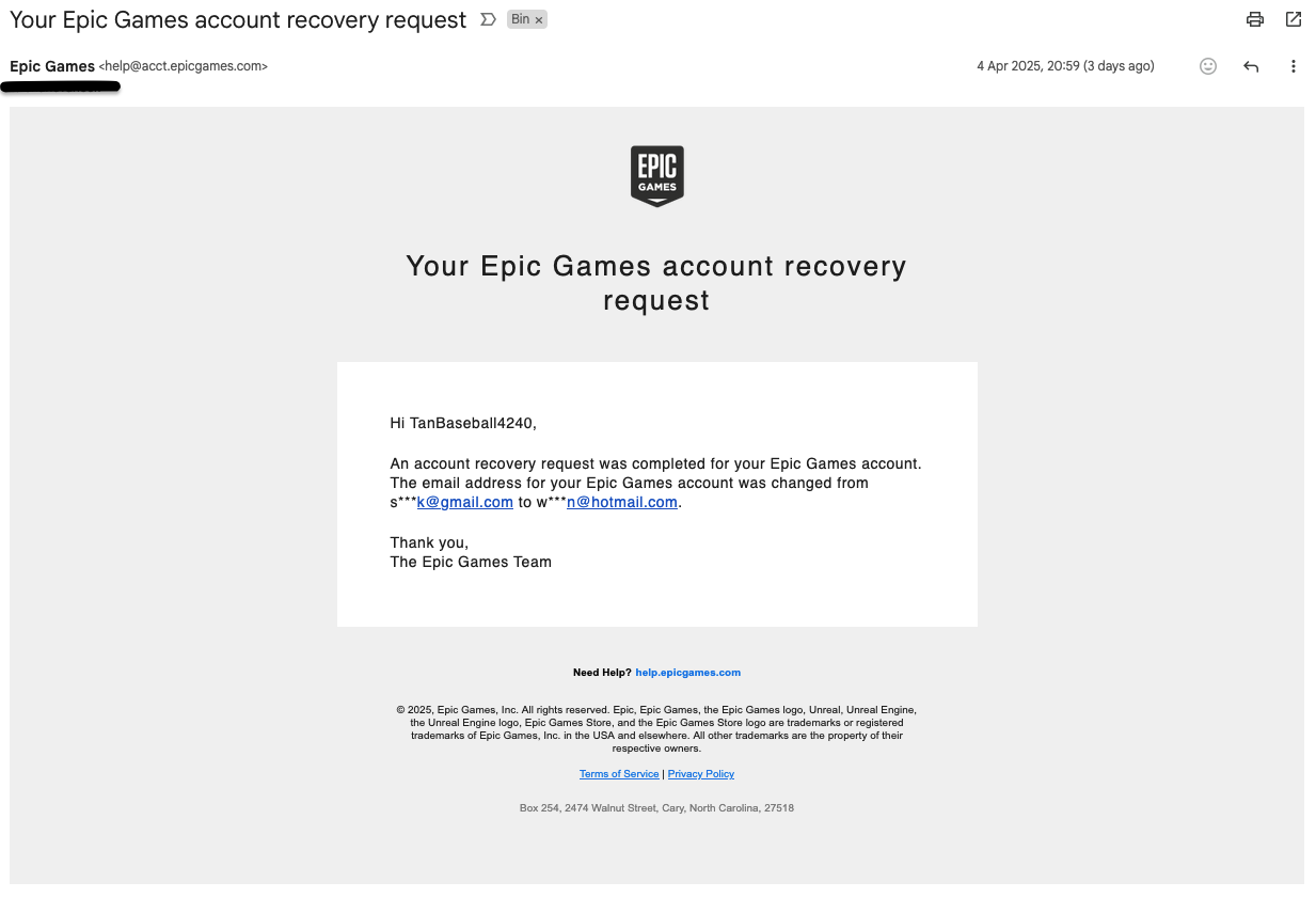 As we can see, this doesn’t seem to be phishing; it appears to be coming from a legitimate source. When I perform any activity on my account, this is the same email that Epic sends from.