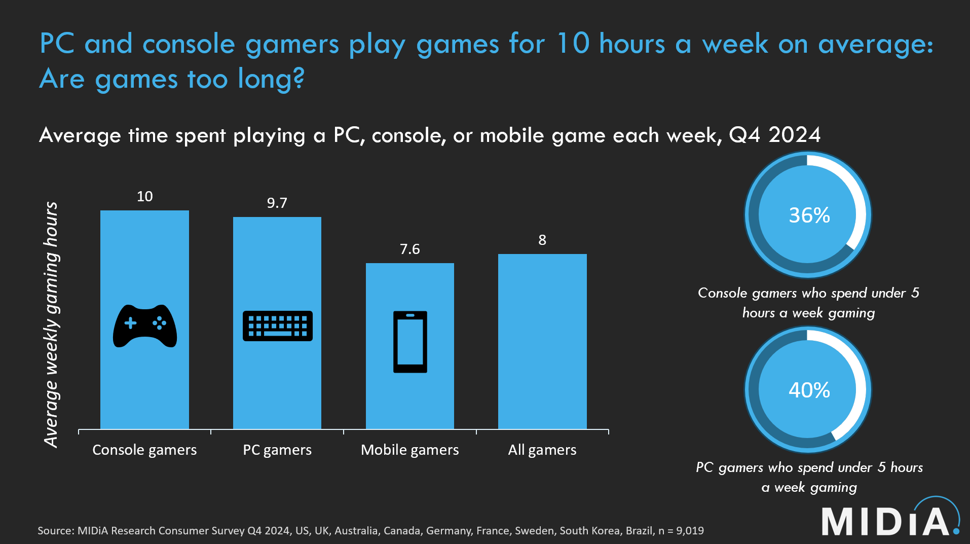 MIDiA’s consumer research for Q4 2024 underlines just how little time consumers have to play. Console gamers spend – on average – 10 hours gaming per week, while PC players spend a little less (9.7 hours).