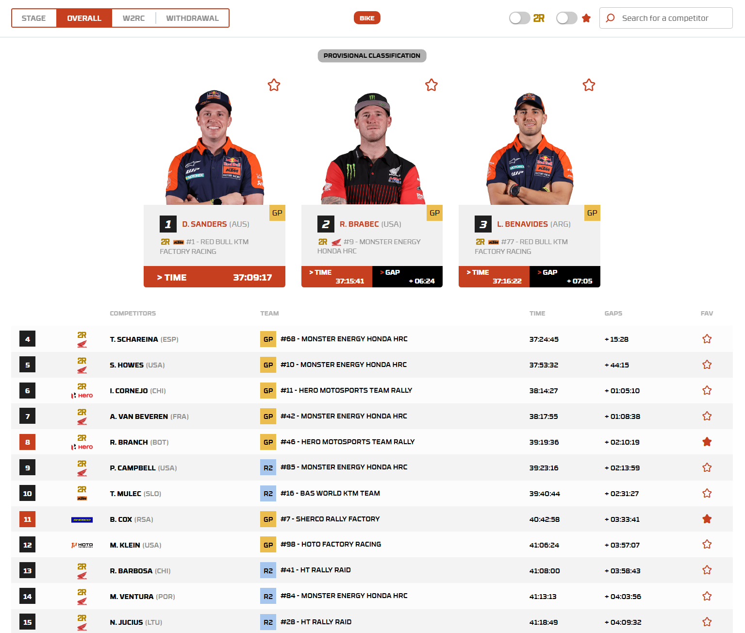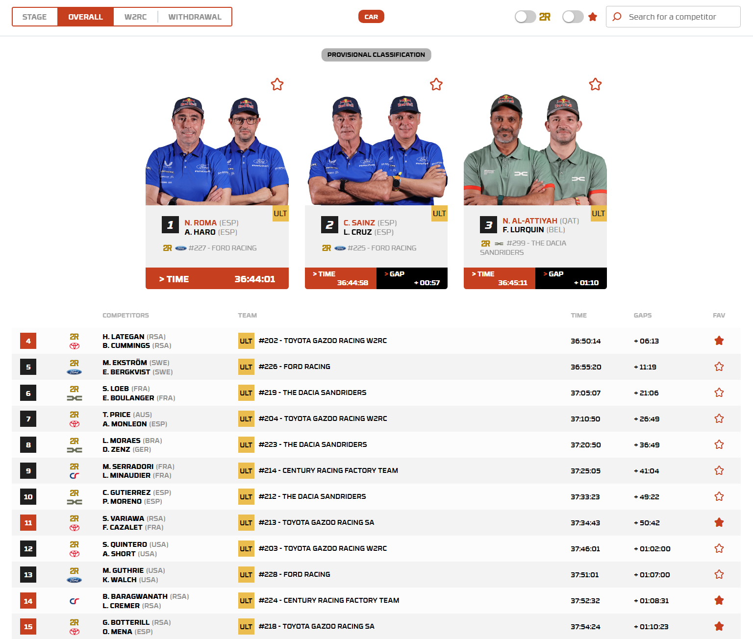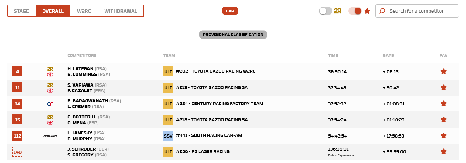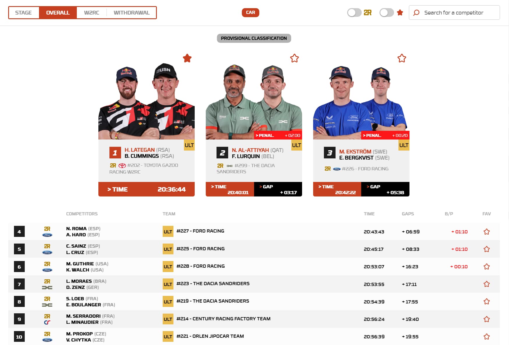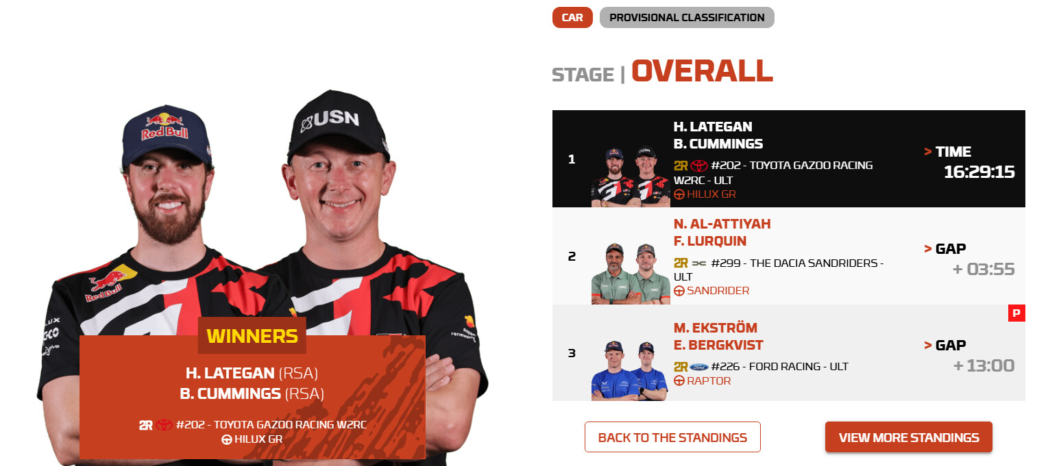 Nasser Al-Attiyah followed him home in second on the stage and now sits second overall, while Marek Goczal, in the Ford Raptor, managed to cling to third overall despite an extremely tough day at the sharp end.