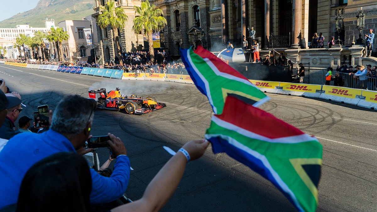 Looks like Sandton area (Katherine Street). Bottas in a Merc, Coulthard for Red Bull.