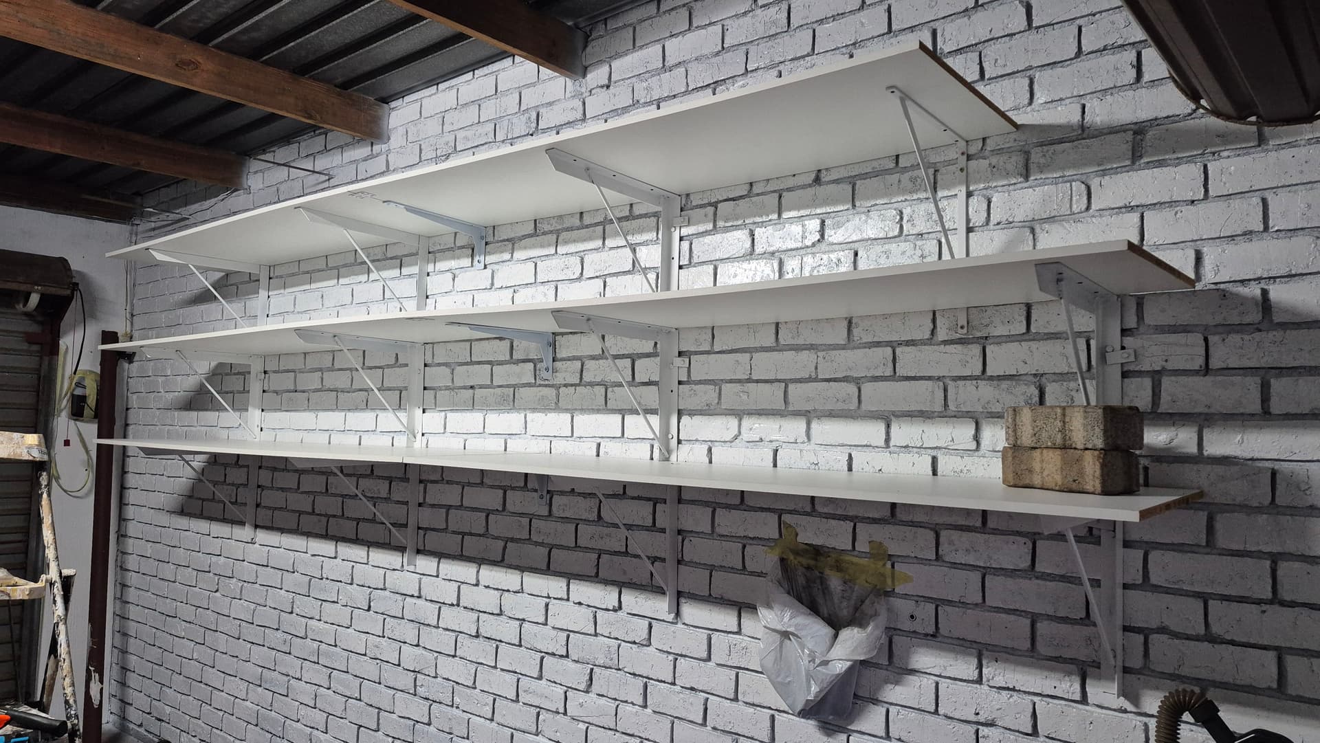 The shelves are done. They are not perfect, they are not necessarily level everywhere, but they’re garage shelves and it doesn’t matter. Nothing we could do about the heights and sizing of the existing brackets, and we were not going to replace all the brackets. It’s close enough, it’s good enough, I’m happy. And I am kaput. My mom had to Zoep in the last few holding screws because I couldn’t lift the cordless drill any more with my wet noodle arms.